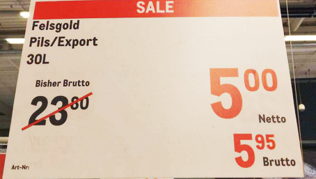 Alles muss raus: Zeitgleich zu den brutalen Wasserstandsmeldungen des Dehoga über den Zustand im Gastgewerbe verhämmerte Metro in München das 30-Liter-Fass der Eigenmarke Felsgold mit MHD Ende Februar für schlappe 5,00 Euro glatt. 50 Liter kosteten 11,90 Euro.