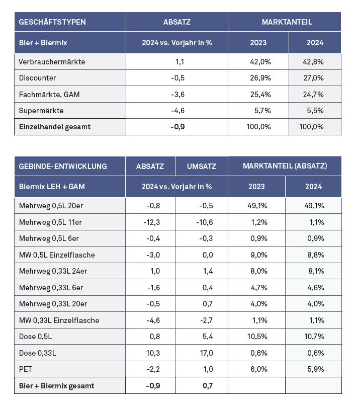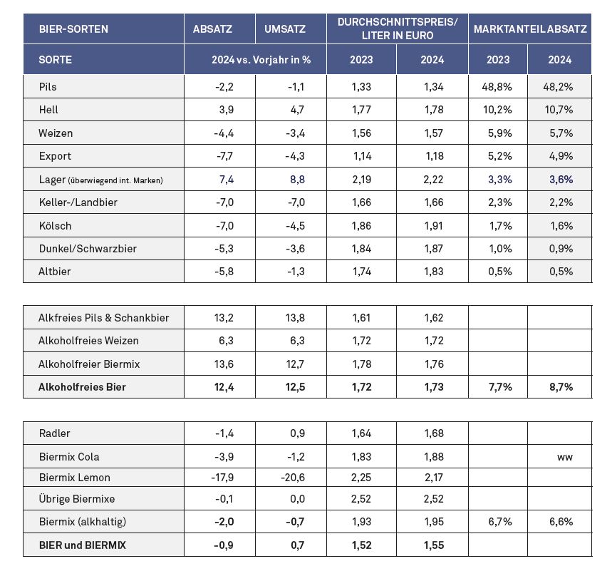 Der Biermarkt bleibt unter Mengendruck. Nach den 3,8%, die 2023 im Einzelhandel weniger verkauft wurden,ging auch 2024 Absatz verloren. Das 4. Quartal fiel mit -2,7% schlechter aus als die Quartale zuvor und zog die Kategorie erneut ins Minus. Preissteigerungen sorgten für ein minimales Umsatzplus. NielsenIQ-Experte Marcus Strobl sieht aber auch Lichtblicke: Hellbier, internationale Lagerbiere und besonders Alkoholfreies Bier haben kräftig gewonnen.
