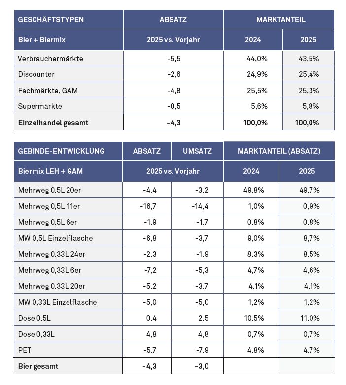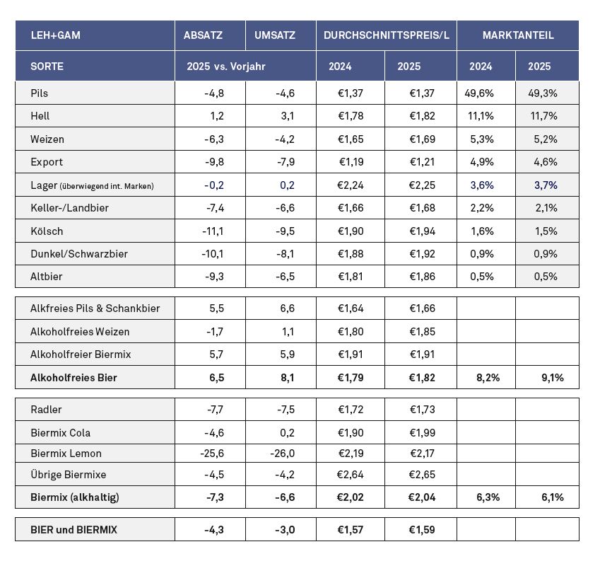Das lausige Bierjahr ist amtlich beglaubigt: -6,0% Absatz weist das Statistische Bundesamt für 2025 aus (vgl. S. 20). Im Einzelhandel lief es nur unwesentlich besser.