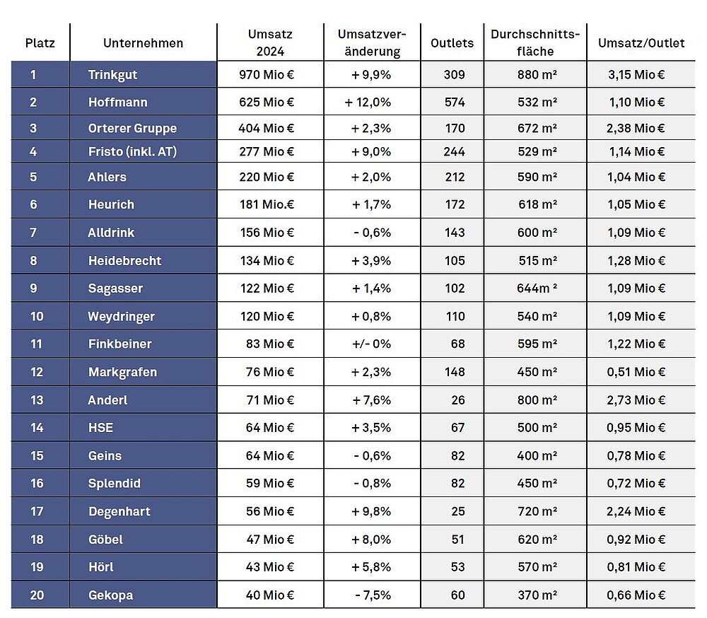 2024 war kein gutes Jahr für den Fachhandel. Die großen Ketten konnten dennoch zulegen. Auch durch Neueröffnungen (Trinkgut) und Übernahmen (Hoffmann). Der Elite-Club VDGE (23 Mitglieder, ohne Trinkgut) errechnete auf bestehender Fläche 1,9% Umsatzplus und damit mehr als die 1,8%, die Nielsen IQ für Kaltgetränke im gesamten Einzelhandel meldet. In der INSIDE-Hitliste sind nur die Filialbetriebe exkl. Kooperationspartner enthalten.