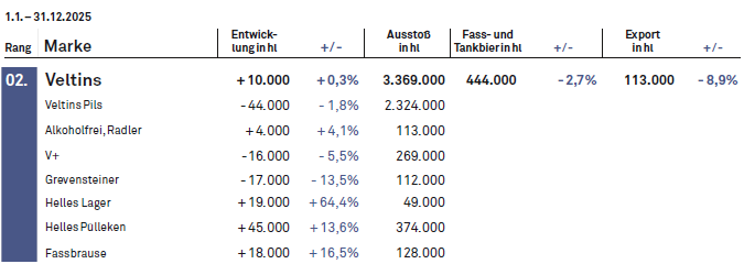 Auch falls 2026 noch keine großen Zusatzvolumen durch neue Artikel zu erwarten sind und sich Veltins dem Markttrend nicht vollkommen entziehen kann, kommt in Grevenstein keinerlei Unruhe auf. Die Renditen der letzten Jahre haben die Kriegskasse prall gefüllt, Kostensteigerungen fängt die aktuell umgesetzte Preiserhöhung auf. Die mit enormen Investitionen hochpolierte Produktionsstätte bleibt ausgelastet: Seit Ende Dezember wird die Neuerwerbung Karamalz in Grevenstein hergestellt und abgefüllt. Geplant sind für 2026 knapp 200.000 hl.