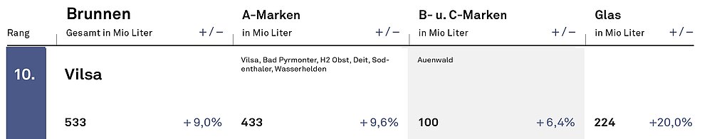 Vilsa hat im Norden Gewicht. Das macht die Verhandlungen mit dem Handel manchmal leichter und oft auch kürzer. Die Treue der Kunden übersteht auch Preiserhöhungen. Die Marke dient als Frequenzbringer für Händler wie Famila, Rewe, Edeka. Der Aktionsanteil von Vilsa liegt bei rund 40 %, hinter dem von Volvic (55 %, kundenspezifisch sogar 70 %). Auch im derzeit schwierigen Gastronomieumfeld gelang es den Norddeutschen, noch Absätze draufzusatteln, immerhin 3,9 %.