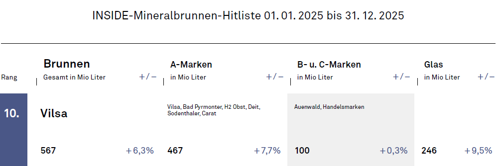 Es war nicht nur das Wassergeschäft in Weichpackungen der Marke Carat, die Vilsa im Jahr zuvor von Christinen gekauft hat. Vor allem die Galionsfigur Vilsa stürmt weiter. Während die B-/C-Marken in etwa stagnierten, legten die Hauptmarken um satte 7,7 % zu. Beim Biovermarkter Denns hat die Marke Vilsa eine Dauerlistung.