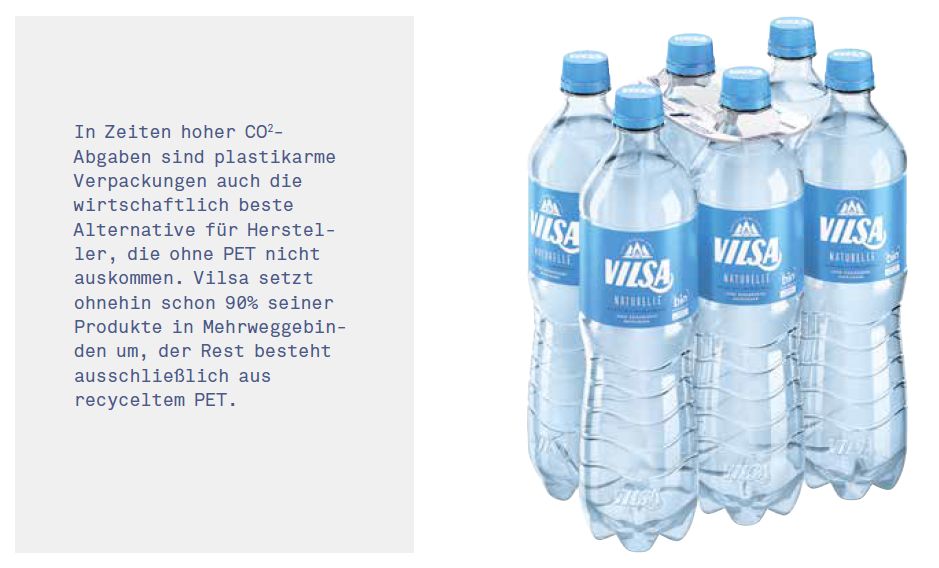 Mit einer intern so titulierten „Tschüssfolie“ verabschiedet sich Vilsa von Foliengebinden: „Diese Folie verschwindet bald wie auf magische Weise“, verspricht der Brunnen vor der für Mai 2025 geplanten Umstellung auf den über KHS-Technologie gesteuerten „VILSA NIX-PACK“ – einen Sixpack für alle Einweggebinde (inkl. Erfrischungsgetränke), der statt mit Schrumpffolie durch Klebepunkte zusammengehalten wird – plus einem Griff aus recycelbarem Karton anstelle des bisherigen Kunststofftragegriffs.