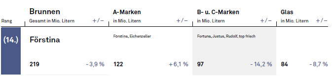 INSIDER berichten, dass der Brunnen die brachiale Versorgungslücke über einen bis zu dreimonatigen Produktionsstopp bei der C-Marke Rudolph schloss. Die sehr margenarme Marke verlor infolge dessen wohl mehr als 10 Mio Liter. Alle anderen Marken, insbesondere Förstina und Eichenzeller, legten zu – erfreulich aus Förstina-Sicht, hatte der Brunnen doch 2021 rund 20 Mio Liter verloren. So bleibt es bei einem relativ geschmeidigen Minus von knapp 4%.