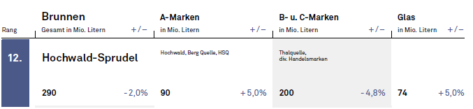 Umsatzjäger aus der Provinz: Der Abfüll- und Aseptik-Spezialist Hochwald Sprudel hat nur in kleinem Umfang von den Verwerfungen auf dem Mineralbrunnen-Markt profitieren können. Viele Edeka- oder Aldi-Mengen waren nicht dazuzugewinnen. Die Handelsmarken (in der Hitliste unter B&C-Marken verzeichnet) verloren knapp 3% auf 185 Mio Liter.